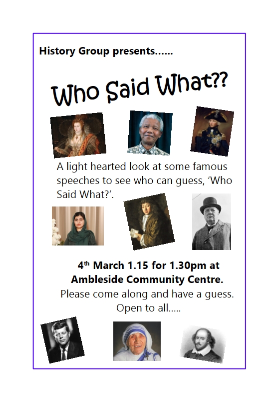 John Harris gave an insightful quiz based on quotes from famous speeches by even more famous people. There were about 20 people there and the tea and biscuits were lovely