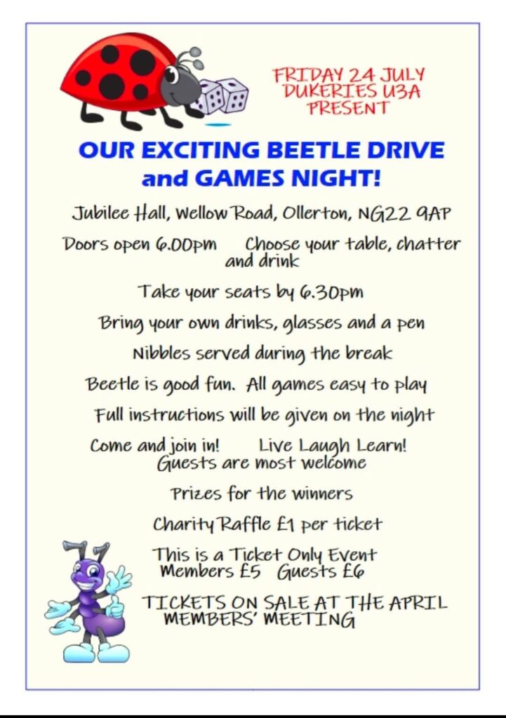 Dukeries U3A is pleased to invite you to a fun-filled evening of games, laughter, and friendly competition! Whether you're a Beetle Drive pro or a complete beginner, everyone is welcome.