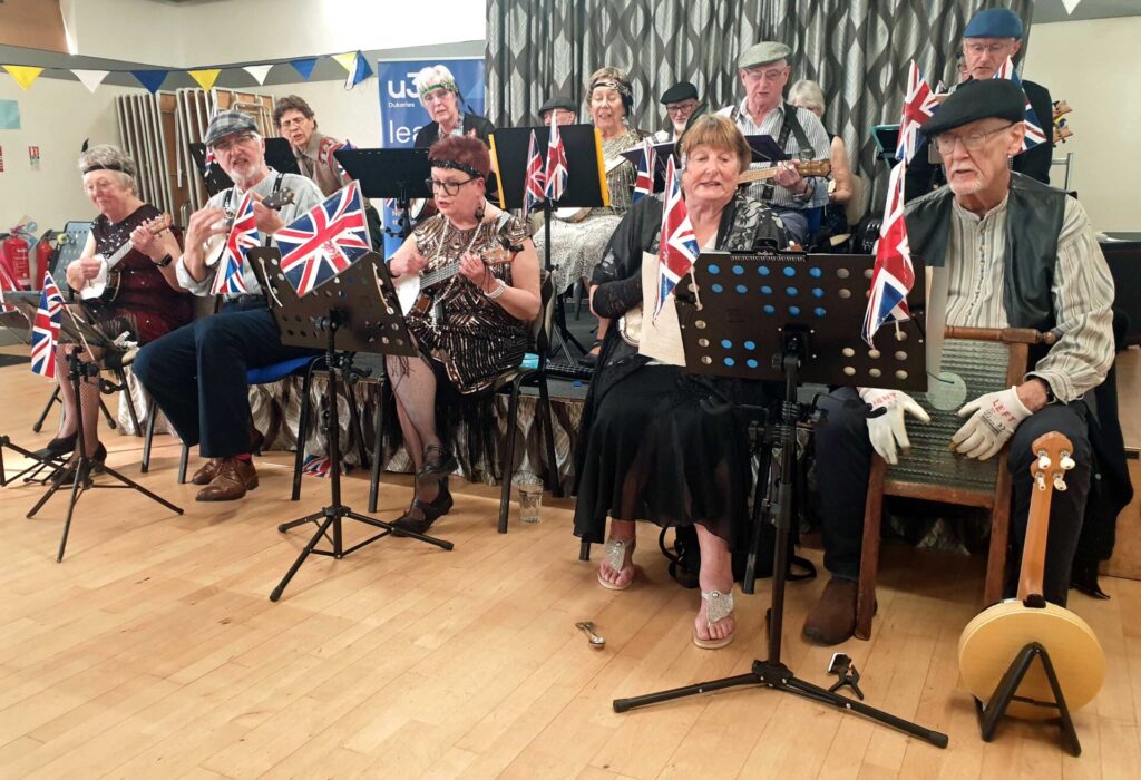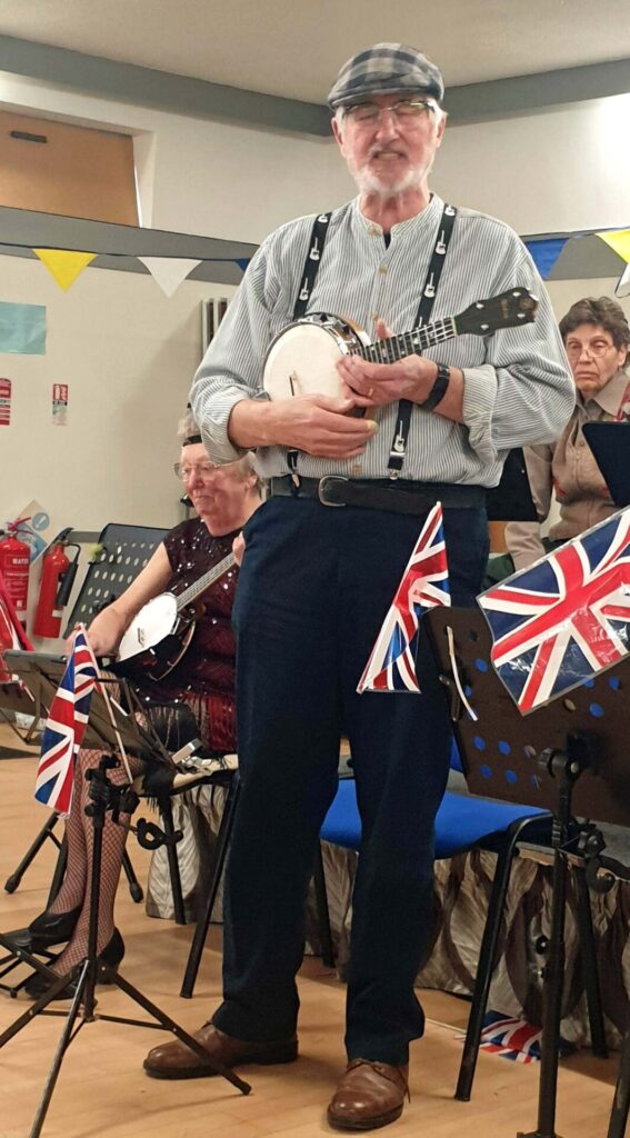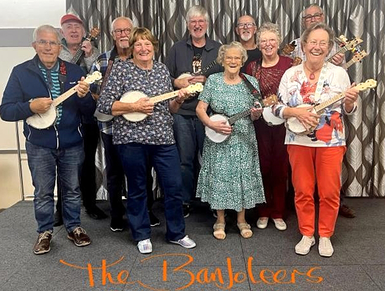 'The Banjoleers are a 16 strong group of like minded individuals, getting together twice a month to play, laugh and enjoy ourselves, We like to think we are ‘Improving / advanced’ players but don’t let that fool you or put you off. If you would like to give it a go, come and join us. We're also looking for some additional voices, so even if you don't fancy playing an instrument, come along with your voice and have some fun.